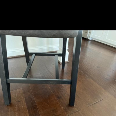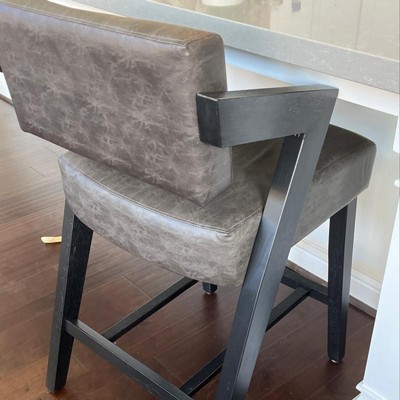 Looking to add a modern edge to your kitchen or entertainment space? This non-swivel stool utilizes unique angles to create a striking contemporary statement without sacrificing comfort or functionality. The versatile black wood finish is gently contrasted by charcoal faux leather upholstery on its seat and adjustable spin back. With a geometric design concept complemented by angular arm rests and a reinforced footrest for comfortability, this counter-height stool is both an aesthetic and practical choice. Assembly required.