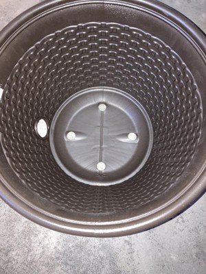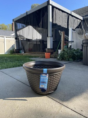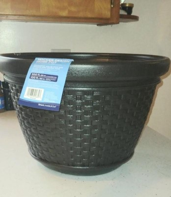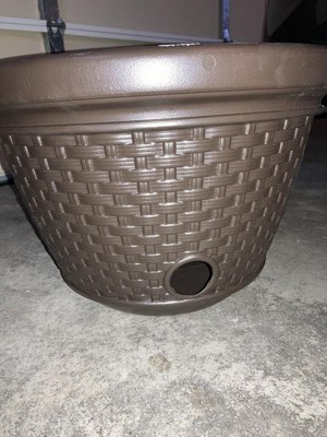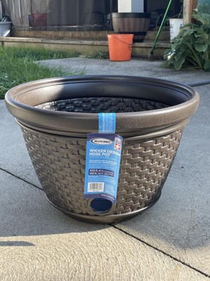 Suncast 100 ft. Wicker Hose Pot, Decorative Storage w/ 4 Drain Holes, Java