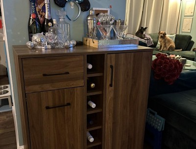 The instructions were easy to follow but it’s very time consuming to put together. It’s made of particleboard, but it seems pretty sturdy! I can’t wait to start entertaining guests in our home!