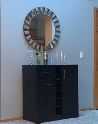 - Sliding storage compartment with 1 adjustable shelf, deep drawer style, holds up to 12 tall liquor bottles