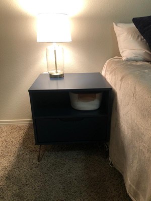 This nightstand checked all the boxes for what I needed. Simple, sleek and very sturdy. It probably took a hour and half to put together by myself, but I was taking my time. The legs/base are more of a brown kind of color, which didn't bother me, but if you are looking for a brassy color, this isn't it. I also didn't attach the backboard, but that didn't affect the sturdiness at all. Fits great in my space and just the right height for my new platform bed. Happy with the purchase!
