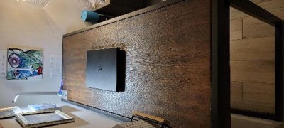 I love the color. it looks really rich. Rustic wood in a modern design.