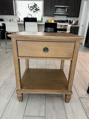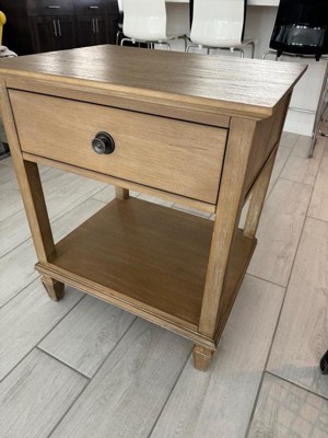 [This review was collected as part of a promotion.] This bedside table is great and works well with the furniture I already have in my room. It shipped already assembled (except for the leg pegs at the bottom) and while it is closer to 50lbs, it's easy to move and carry. I like the pale wood color and the table provides a ton of storage while on the bottom, on top, or in the large drawer. One thing I'm not a fan of is on the bottom of the legs are plastic pads to help protect the floor, but they are rounded so the table can tilt slightly back and forth and it's not flat. Would be nice if they used just a flat plastic piece.