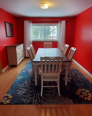 This is a gorgeous piece and brings together all the colors in our dining room exactly as we'd imagined. It is such a nice pop of color, love the pattern. Waited for our furniture to be delivered and hadn't opened up the carpet and was a bit worried in case it didn't work. It did, and beautifully so :) !!