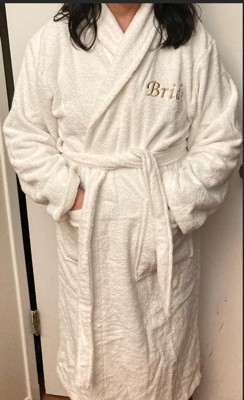 Gold embroidery adds an elegant touch to this beautiful bathrobe. Perfect for Bride to be. The bathrobe is thick, soft and comfortable. I love that Turkish cotton become even more softer after every wash. Great quality item that would last a long time.