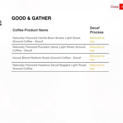 This coffee tastes great and is decaf. BUT, Good & Gather refuses to say what decaffeinating process they use. Why? I won’t be buying this anymore, after drinking it for years, because I presume they use the toxic chemical method over the Swiss water method.