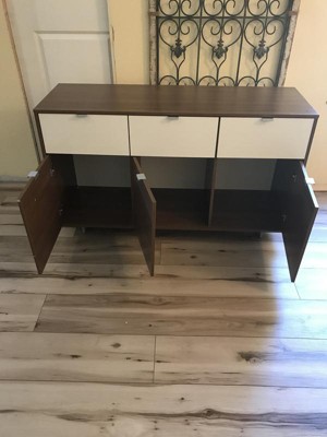 [This review was collected as part of a promotion.] This sideboard is very heavy. It definitely needs 2 people to carry it unless you wanna break your back. In general, it has beautiful finish look and design. It includes 3 drawers and 3 cabinets. It isn't a full function cabinet drawer, but has enough room for us to keep magazines, DVD or other extra stuffs in the living room. It took at least a couple hours to finish installation. I did all by myself so it may take a little bit quicker if I have an extra hand.