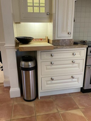 We had an odd corner for our trash can and our old one would hit the counter every time we opened and make a loud noise. We love this trash can and it’s really well made!