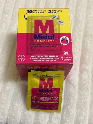 • 10 count pouches with 20 count total Midol Complete On the Go Menstrual Pain Relief Caplets with Acetaminophen, Caffeine and Pyrilamine Maleate for Menstrual Symptom Relief