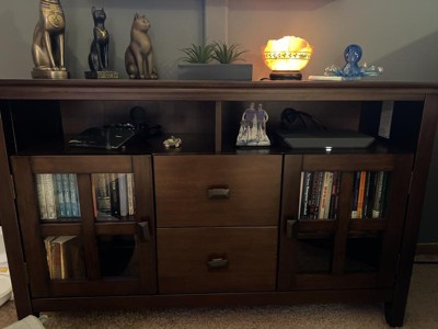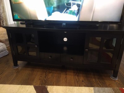 Very disappointed in this piece of furniture. One of the drawers are uneven because the holes in that particular drawer were not lined evenly. The doors do not match. I have two completely different color doors, much more noticeable in person. Doors are two different shades. I’ve purchased furniture from target before and never had a problem. I’m so upset, I didn’t even finish putting the knobs on. Also some holes were pre-drilled and others looked like they were poked with a safety pin. Only good thing about this tv stand is that our 65” fits nicely on it.