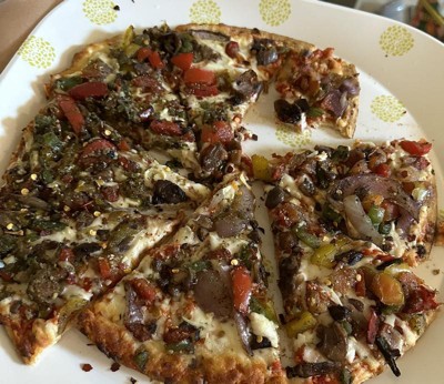 Pretty good overall. Thin, cracker like crust. Lots of veggies. Mushrooms seemed to dominate. Short on roasted green peppers and onions. Veggies could have been distributed better over entire pizza instead of looking like dumped in middle of pizza. A bit short on pizza sauce. A bit of heat, but not overpowering. Good flavor overall. I would buy again.