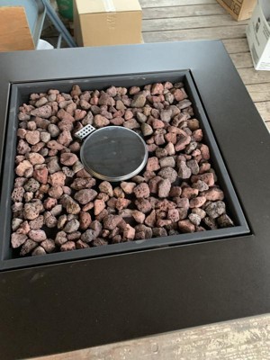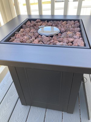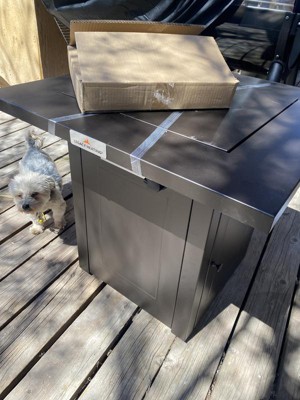 What a good size fire pit, perfect for our outdoor patio area. The hollow base has a door to open and allow to insert a 20 pound propane tank. I really like how fast it starts up and how warm it feels. It's twenty eight inches in length, twenty eight inches in width and twenty four inches in height. During the day keep the cover lid on and use it as a table and during the evening take off the lid for an illuminating fire presentation. It comes in a mocha color finish, rust resistant and pretty easy to scratch by the way. Easy to follow assembly instructions that taken me about 25 to 30 minutes to have it fully assembled and up in flames. All I needed was a Philips head screwdriver to put this fire pit together. A four pound bag of lava rocks is included in this kit and be sure to not dump out the lava rocks, instead place the lava rocks by hand due to the dust in the bag to avoid clogging the burners. We are pleased with sleek smooth design and amazed with functionality of this Fire pit.