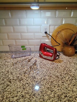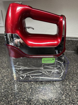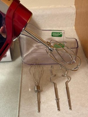 [This review was collected as part of a promotion.] Nice mixer. I love the color red, matched my kitchen. Light weight and easy to use. Comes with 5 easy to change attachments. I like the storage case that comes with it. Easy to store the attachments and keep everything together. It’s easy to store but requires a little elbow grease to get the storage case off. Nice kitchen tool to have.