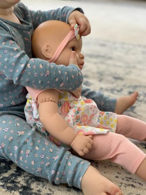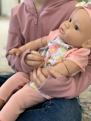 I have two daughters that are ages 6 and 2 and they love to play with baby dolls together! This Doll has been on oumf their favorite for many different reasons like its size and its realistic features. The baby is dressed in a floral sleeper with leggings, a pink jacket and matching headband. The baby is great quality and well put together with hard legs, arms, neck, and head to keep the baby well out together. The tummy of the baby is soft and cloth like that makes great for cuddling and easy for the little ones to hold and carry around. l so real to your child, encouraging lots of cuddles! My daughters have spent hours playing together with their new doll and have been on lots of adventures together This baby doll come with a blanket, milk bottle, and adoption certificate for her making great accessories to add to their roles while playing house.
