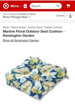 Bought the navy blue chair. Took forever to be back in stock and even longer to receive once ordered. But very happy that I stuck it out. Love my new chair!!! The cushion seen is also sold at Target. Should have purchased 2 chairs.