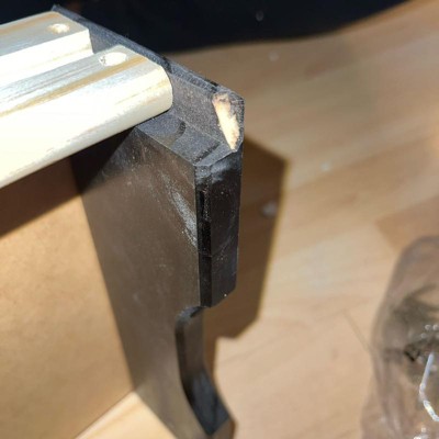 while putting item together. the top wood piece is cracked. the thing is more than halfway done. i requested a replacement but I have to mail this one back first. waste of time and not fun to put together.