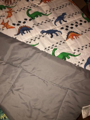 Do you like dinosaurs like I do? This dinosaur bedding pattern has all the giant lizards you can handle making tracks across your bed. The white base cloth is printed and reverses to a gray woven solid color. The decorative pillow and shams help you complete the top of the bed in style. Face and back is printed 100% microfiber woven cloth with 100% polyester fill. This item is machine washable, but please be sure to use appropriate sized machinery to avoid any excess wear on the items. Includes: one twin comforter 68x86 inches, one standard sham 20x26 inches, and one dec pillow 16x16 inches.