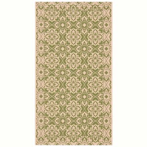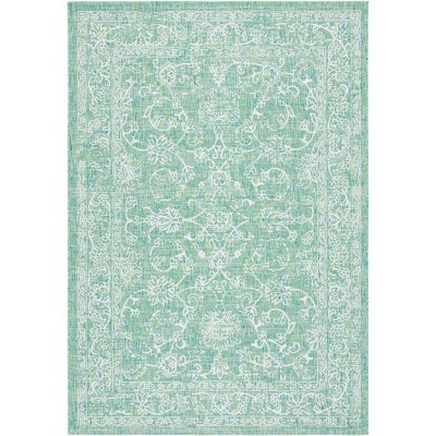 Intricately designed with a timeless pattern that echoes the finesse of ancient craftsmanship, the rug showcases an elegant array of floral motifs and ornamental designs, set against a subtle creamy backdrop that accentuates the lush green detailing. Whether it graces your patio, deck, or living room, the design is certain to be a captivating centerpiece.