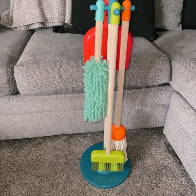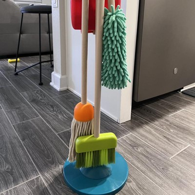 - Includes: This pretend play set comes with a mop, broom, brush, dustpan, duster, and a storage stand.