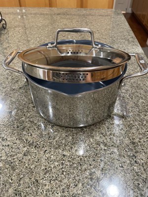 [This review was collected as part of a promotion.] This pot has a heavy bottom, really need this with my Italian range that has a lit of b.t.u 's and my other stock pots were so thin on bottom, my gas was too powerful. Love the non-stick, the lid has drain lid and glass so I can see the food. Nice looking and heavy, but not as heavy as Le Creuset or Staub, which are too heavy sometimes to drain.