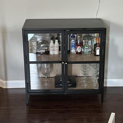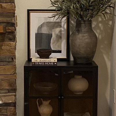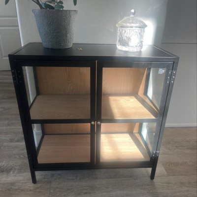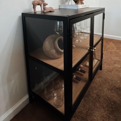 Make an easy decor upgrade with the Crystal Cove Furniture Collection from Threshold™ designed with Studio McGee. Set on a black metal frame, these contemporary cabinets feature built-in compartments with easy see-through glass sides and front to lend mixed-material appeal to your space. Offering ample room to display books, decorative bowls, photos and more, these black and woodgrain cabinets easily open and close with the gold-accent knob and can be placed in any room for an elegant display.