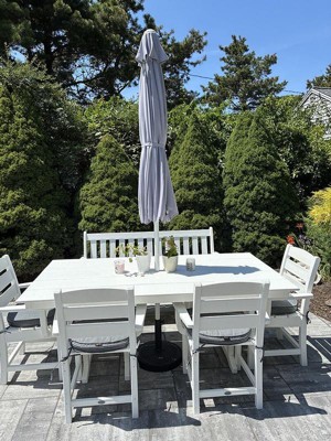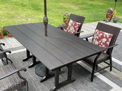 The Lakeside 37" x 72" Rectangle Farmhouse Dining Table by POLYWOOD is just what you need to add rustic charm and character to your patio or deck. This roomy table features an inviting full-plank tabletop and sturdy pedestal-style base, meaning you have plenty of space for alfresco dinners, game nights, and craft time with the kids.