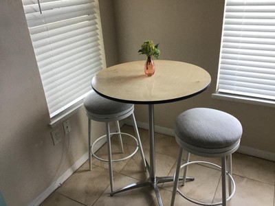 [This review was collected as part of a promotion.] This round wood cocktail table is cute and easy to assemble. It comes with two poles, one 30” and one 42”. I’m currently using the 30”, the 42” is a little too tall for my liking. I have it set up in my basement for entertaining.