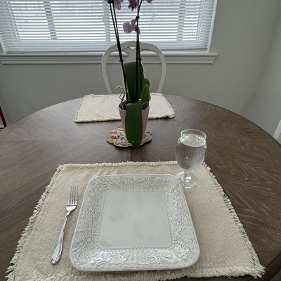 16pc Stoneware Floral Dove Dinnerware Set White - Elama: Rounded Square Dishware, Microwave & Dishwasher Safe