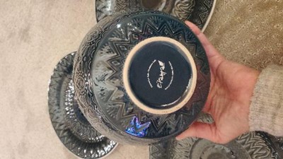 So in love with this dining set -- the color, the design, the feel. Gorgeous! I particularly like the bowls, a more shallow and wide shape. The pieces have an almost hand fired look and feel and go from microwave to dishwasher with no problem. Had to order online but worth the wait for delivery. Hopefully I can order another set!