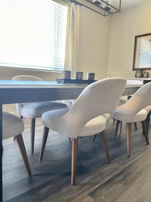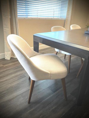 [This review was collected as part of a promotion.] The cream dining chairs are comfortable and high quality. They were easy to assemble and seem quite durable. The design of the chairs go great with my mid century modern decor.