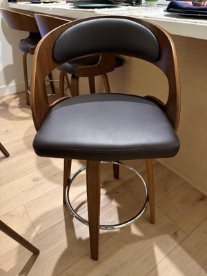 Add a touch of mid-century modern glamour to your home with the Shelly Mid Century Modern Swivel Faux Leather and Wood Bar Stool from Armen Living. The retro silhouette exudes timeless appeal that would easily fit into any home regardless of the existing design theme. The Shelly kitchen stool features a beautiful wood frame and seat back that wrap around a luxurious high-density foam cushioned back and seat. Upholstered in soft faux leather upholstery, the Shelly provides a full mobility with a 360-degree swivel function that enables you to engage with your guests regardless of their place in the room at parties or gatherings, making this ideal for entertaining. The open seat back provides breathable seating and allows for easy movement around your home. Available in a 26” or 30” seat height, the Shelly stool can easily incorporate into your kitchen, office, home bar, or den. The Shelly Swivel Faux Leather and Wood Bar or Counter Stool is available in your choice of a walnut wood finish with brown or cream faux leather upholstery or a black wood finish with gray faux leather upholstery.