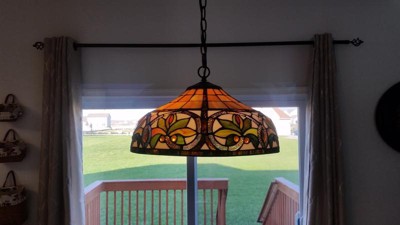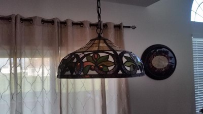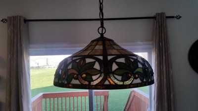 I LOVE IT !!! I've been wanting a Tiffany lamp but never could afford one. This fits my pocket book not to mention it's perfect size to hang above the round kitchen table in the kitchenette. Colors are beautiful and even more beautiful when the light is on. It was very easy for my husband to install. Very good, detailed step by step (with pictures lol) instructions that I think I probably could have hung it myself! It arrived a lot sooner than expected which was ok with me because I am having a Pampered Chef Party this week and now I get to show off my Tiffany Lamp. I hope the pictures help you out. However when I look at the pictures from end, the lamp shade looks oblong and narrow. That is not how the lamp is, it's normal shape and beautiful.