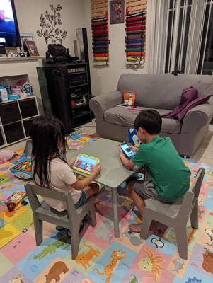 [This review was collected as part of a promotion.] Our family is loving this new table set. It was easy to install - literally took 10 minutes to put together the table and chairs. Kids love using it to play tea party and eat off of. Husband uses it as a coffee table for his drinks. I love the grey color. It's just great overall.