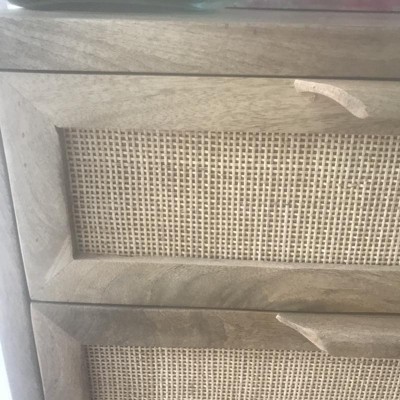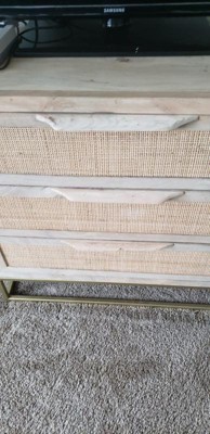 [This review was collected as part of a promotion.] Quality-built cabinet. Heavy but easy to remove the drawers with a simple turn of the catch in the back so that it can be moved without assistance. This cabinet looks great in my guest room, which is painted a light yellow with white furniture and accessories. The drawers are large enough and open smoothly for storage. The only problem I have is that during shipping one of the plastic pieces on the bottom of the legs was crushed. The dresser wobbles a little because of this. The wood and rattan is simple and unfished, and the gold base looks distressed a bit, which adds to the charm.