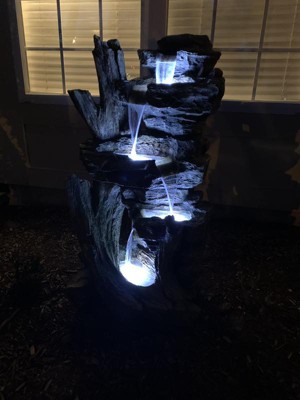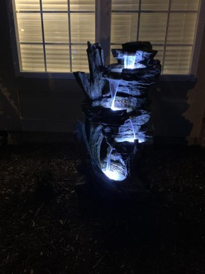 [This review was collected as part of a promotion.] This 39” tall outdoor Alpine garden tower fountain added extra charm to my front yard. It Catches the eye of everyone walking by. This fountain looks very natural with beautiful green shaded soft rocky exterior. The sound of water is so relaxing and soothing. I am planning to add few more flowering plants and rocks around the fountain to make it look more highlighted. I just love how water flows from top step to the last step and the branch accent on the side of the statue gave the realistic natural feel . Very easy to install, it just took 20 min to get it installed. we had to go purchase an outdoor power strip that had two outlets, as the fountain lights had one plug and the pump has another. This fountain has inbuilt LED white lights. This is very attractive piece. Got so many compliments! This water fountain includes all necessary parts and a pump, to begin creating an outdoor oasis. We used distilled water as instructed. Behind the statue there is a square shaped opening with slide closure where we put water and the cords run out of the unit. There is a tube that goes in to the water, once we switch on the unit the tube is going to pull and carry water to the top of the fountain and functions as designed. All together we had put 4 gallons of distilled water in it. Fountain runs very smooth with great flow. It is of excellent quality and not too heavy to handle. This standing fountain measures 21 in L x 15 in W x 39 in H. I would definitely recommend this to my friends and family.