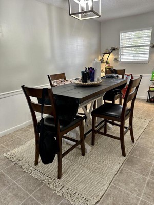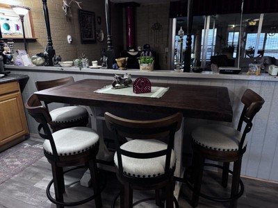 We like this table. The quality is good. We like the style and it fits well in our kitchen dinette area. Our only comment is that we think it would be better if the foot rail on the table was slightly lower. We tend to put our feet on the chair rails, which are 3-4 inches lower. It feels like a better anatomical position when you are sitting, but otherwise we are very happy.