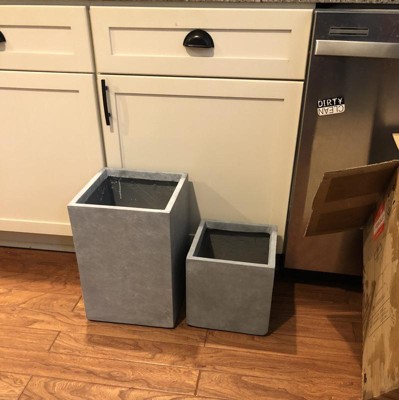 These elegant square planters have authentic concrete finish with visible pores make them beautiful contemporary pieces.The look and feel is true concrete but it weights substantially less than it looks. It also has very smooth finish instead of rough concrete potters you might be used to. The size is very generous and can hold a good amount of plants without looking crowded. It does have a more modern feel to it being straight lines and concrete. Would look great on apartment balcony or large backyard patio. Create a modern space using these tall wide planters. The straight lines and solid gray finish are a hot trend in modern landscape designs. Ideal for succulents and delicate plants that need room to grow. Made of lightweight concrete through an ecofriendly manufacturing process. This composite material has no rubber, plastic, and steel. This material has all the advantages of concrete such as strength, durability, weather and damage resistance.