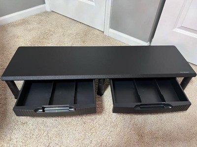 [This review was collected as part of a promotion.] This desk stand is actually really nice quality. It was easy to put together and seems sturdy enough to hold both of my monitors. It’s also fairly large so it’s nice that it has drawers which is an extra great space saver!