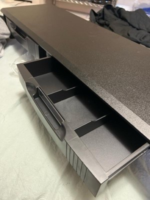 [This review was collected as part of a promotion.] This is a nicely made monitor stand, but unfortunately it’s way deeper than I expected. I have a standard width desk in an L shape. When I put the stand on my desk it took up about half the depth of my desk and didn’t leave room for my keyboard. It has adjustable legs, two drawers with dividers, and a sturdy construction when put together. I don’t plan to use it on my desk, but I think it would work in a closet or pantry for organization purposes. A great buy if you have a deep enough desk!
