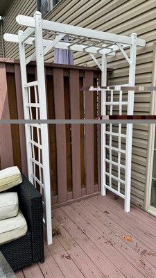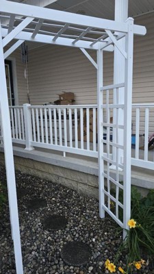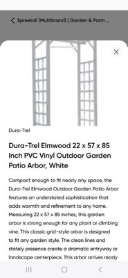 [This review was collected as part of a promotion.] I am so impressed and excited about my new Dura-Trel Elmwood outdoor garden patio arbor, it is extremely well done! The material is durable and construction is solid. The white color is attractive and I already imagine how beautiful it will look when my vining roses will grow up! I am planning to buy two more and make my garden look like fairy tail! The biggest plus is that it is weather resistant meaning snow and rain and sun will not damage it!