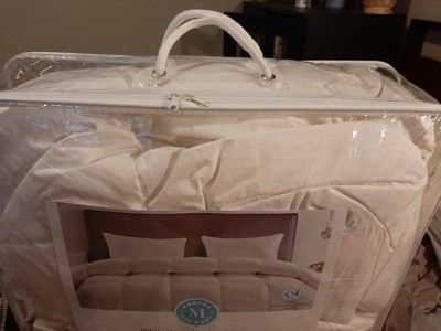 [This review was collected as part of a promotion.] I'm loving this comforter! It's bright white, and the outside has a crinkly feeling, which I love. Some comforters have a shiny, satiny feeling, which I'm not a fan of. It fits well in my duvet cover, and although it's goose/down, so far it's kept me comfortable going into June (although my husband keeps the a/c pretty cool around here!). It came in a zippered clear plastic case with a handle, which I love. We spend some weekends at our cabin, and the case will make it easy to travel with. The only feature I don't love is that it's a bit thin. I don't mind too much, but was hoping it would be a bit fuller. Overall, I love it!