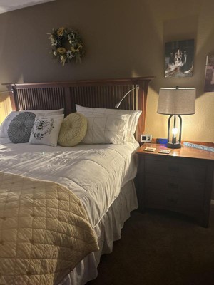 We love these two table lamps for the guest bedroom. They look perfect with the black metal bed & the wall decior. The night light or accent light, in the base, Is such a great feature.