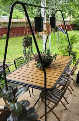 These folding chairs are sturdy and made of good, all weather material. They’ve been left out in the sun and hasn’t faded. Of course, I try not to leave them out in the sun but it has happened! The matching side table is perfect to hold snacks, beverages or even a medium sized plant. The set would be a perfect addition to a small patio although I use it for my back yard seating area. I bought 6 chairs as extras for when we have guests over & we set up tables outside for BBQs. Love that they fold up and can be stored easily. The color (brown & black) go with everything!