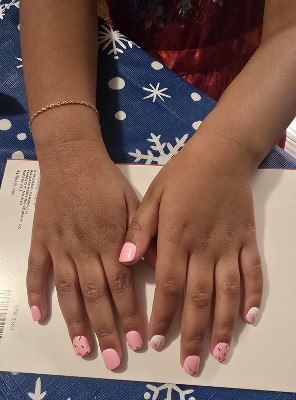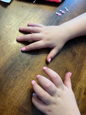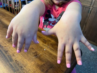 [This review was collected as part of a promotion.] These are so adorable and super easy to apply for kids! I use this brand of fake nails for adults, and I was concerned that they might be too sticky and difficult/uncomfortable for a child to remove, but they are actually a bit less sticky than the adult version but sticky enough that they'll stay put for a while. My daughter loves them! The design is so cute and I love the glitter nails too. It comes with enough for a couple manicures! They're the perfect size for my 8 year old's fingers.