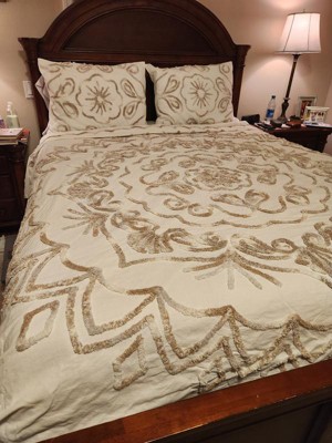 The Madison Park Valeria Tufted Cotton Chenille Bedding Set offers a globally inspired update to brighten your bedroom decor. A large tufted chenille medallion is displayed in the center of the bed, creating an elegant textural look.
