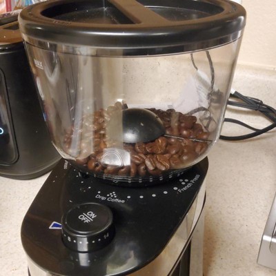 [This review was collected as part of a promotion.] I received this product to try. Was very excited as I have never ground my own beans. The container where you put the beans is very large so you can add alot or a little. Another great feature is that you can adjust the grind. I never knew that that can change the flavor of your coffee. The unit is very easy to operate and doesn't take up much room on my counter. Definitely recommend.
