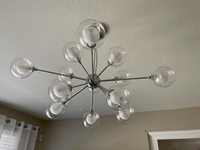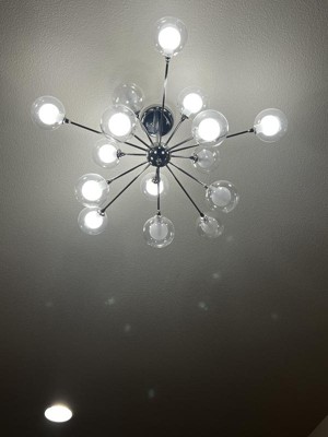 I searched for weeks to find a light feature like this. I especially love that unlike a lot of “Sputnik” style chandeliers, this one is more spread out horizontally and not so rounded on the bottom. It works perfectly for our smaller scale dining room, but would also look great in an open concept! The double looking glass spheres are so unique to other things we have seen. We’ve had it hung for a week now and are still in awe of how much it modernized our 1945 home. We also had a dimmer installed which I highly recommend. The light gets very bright, but looks beautiful on a lower dim.