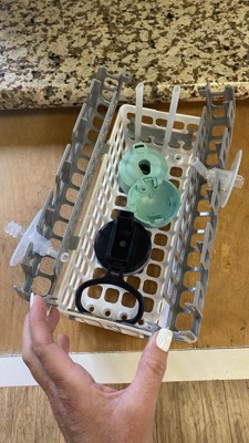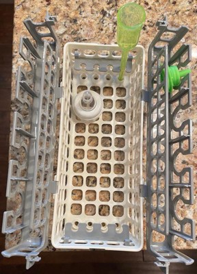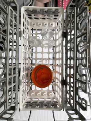 This basket has been a game changer. We use bottles with several parts. This basket makes washing everything in the dishwasher so easy. I don’t have time to hand wash bottles with a baby and toddler. We have two of these baskets and they hold up well. I will say it helps to separate bottle nipples from the tops to make sure everything is really clean. This basket can hold parts for up to 8 bottles, it can do tall or short bottles. This basket keeps everything organized and safe in the dishwasher.