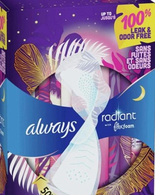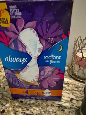 Always Radiant with FlexFoam Period Pads (with wings), provide up to 100% leak and odor-free protection. Always Radiant with Flexfoam pads allow you to wear what you want, any day of the month. The FlexFoam technology allows these pads to be flexible, offering an up to zero feel experience that allows you to move freely and doesn't skip out on protection with a 50% larger back than Always Radiant Regular Absorbency Pads. Accompanied by a clean opening package allowing for quick and easy access, so you can grab a pad whenever needed. With Always Radiant FlexFoam Regular Absorbency pads, up to 100% leak and odor-free protection is possible!