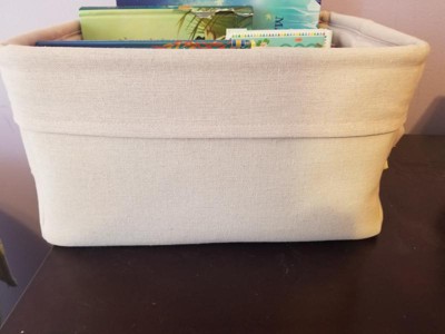 Cute fabric storage bin with divider. Soft pink color and feels sturdy enough for diap rs and wipes. I'll be picking up another.